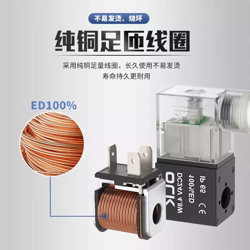 The 080 092 series solenoid valve coil is made of copper wire wound into a simple magnetic field.When electricity passes through the coil, it creates a magnetic force that pulls the 080/092 series solenoid valve core.This movement changes the air flow direction then changes the working position of the pneumatic cylinder.The OLK solenoid valve body adopts pure copper coil ED100% with sufficient turns for long-term operation without overheating