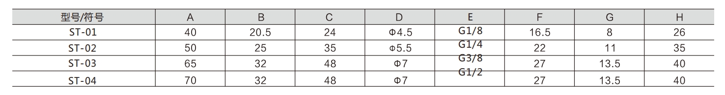 यदि एयर ट्यूब फिटिंग राम्रोसँग चयन गरिएको छैन भने, वायु सेवन वा पोर्टमा थकित हुन, भल्भ कोर पूर्ण रूपमा शिफ्ट हुन सक्दैन, सबै पोर्टहरू जोड्न सकिन्छ। यो रोकिनु पर्छ। ST-01: G1 / 8; St-02: G1 /;; St-03: G3 / 8; St-04: G1 / 2